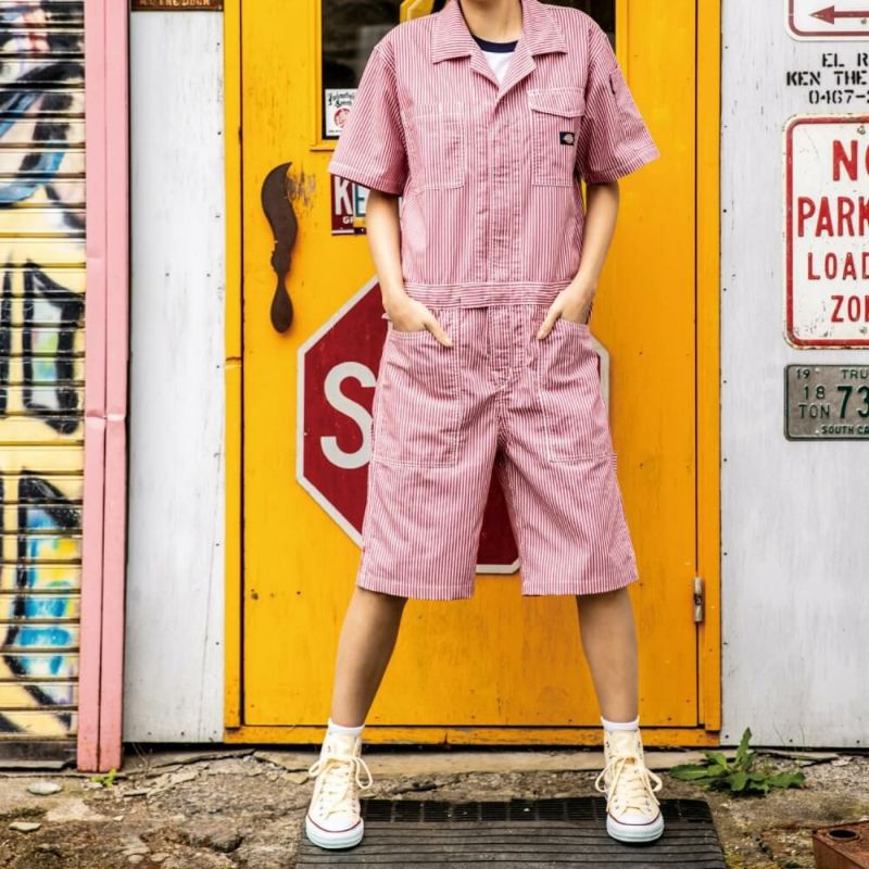 受注生産で人気のショート丈が一般販売に 【Dickies】ライトヒッコリーストレッチ半袖つなぎショート丈