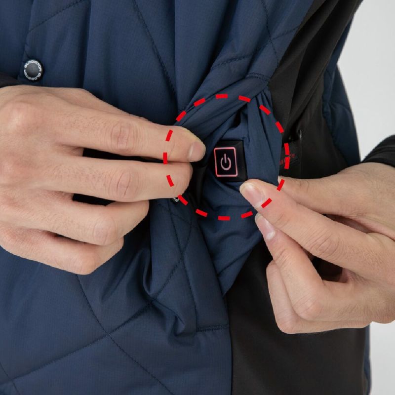 ボルトヒートはモバイルバッテリーを繋いで左脇ポケットある電源スイッチを長押しですぐ稼働。