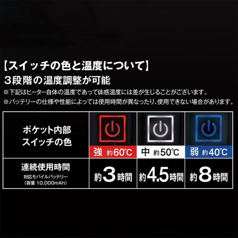 フル充電された公式バッテリー(GB-852)使用で強(60℃)なら約3時間、弱(40℃)なら約8時間使用可能