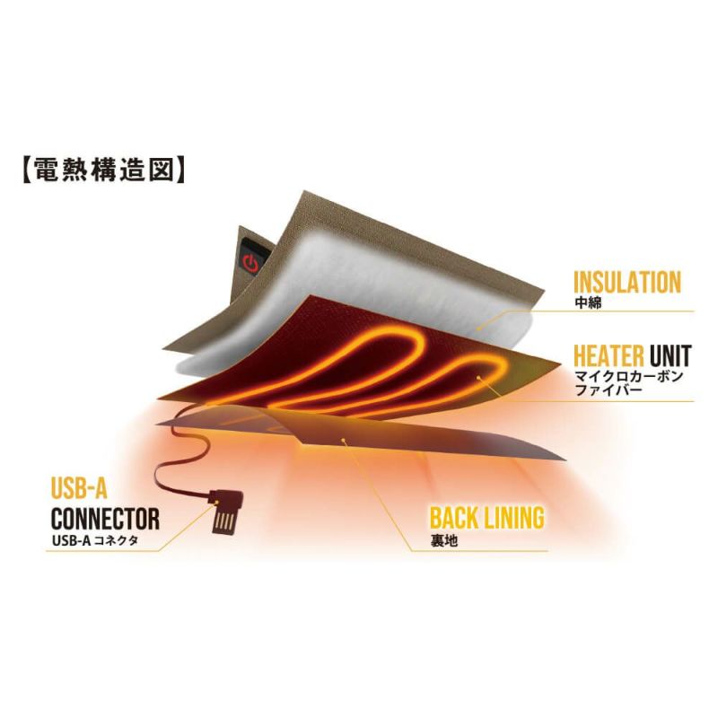裏面にアルミプリントを施すことで熱を反射し保温効果を高めた電熱ベスト。