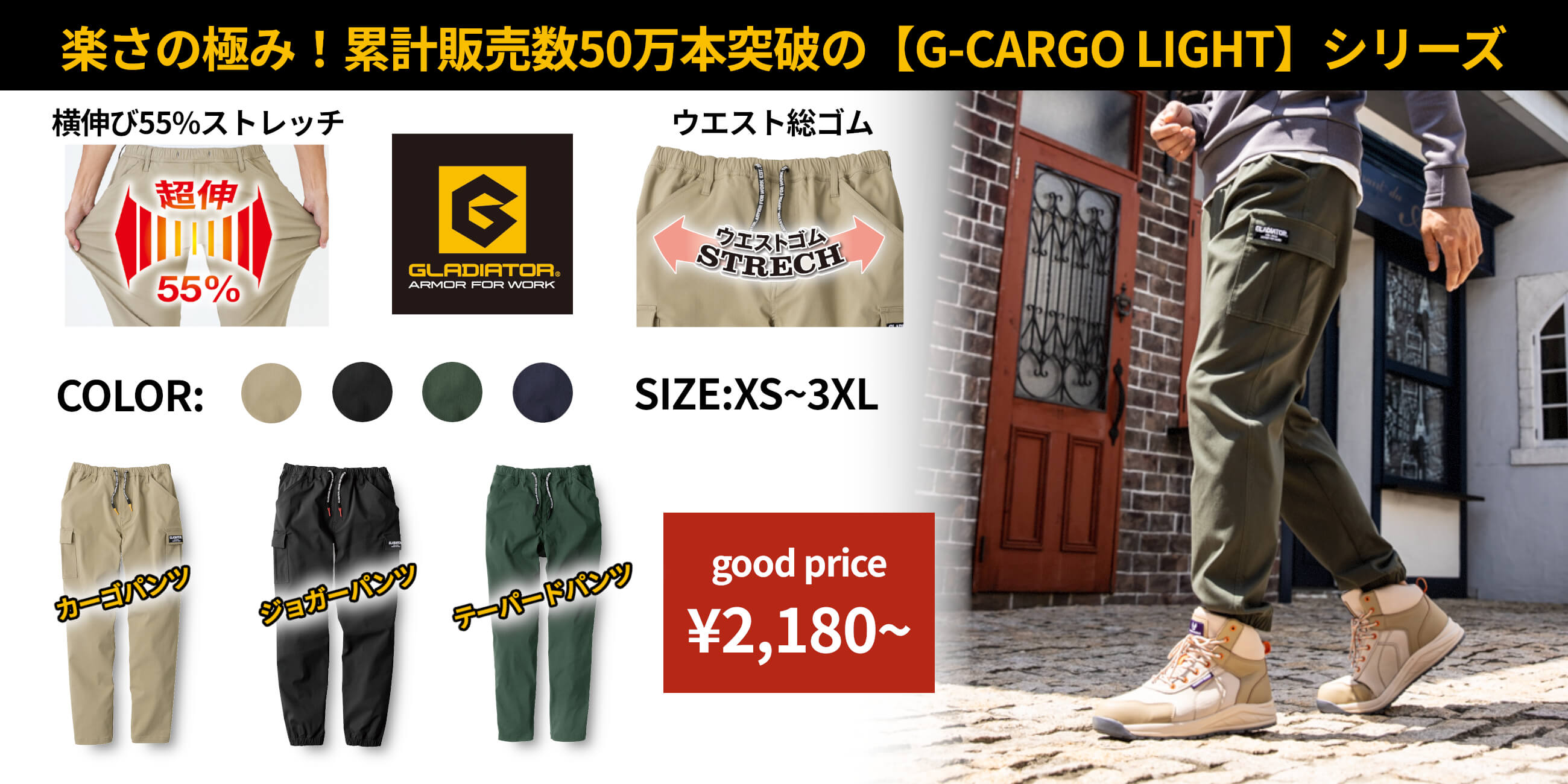 他の画像を見る 商品番号:G-2025 累計50万本以上売れている超ストレッチシリーズ 【GLADIATOR】G-カーゴライト ジョバーズ超ストレッチカーゴ 横伸び25%以上ストレッチ ¥ 2,730 税込 お気に入りに登録する