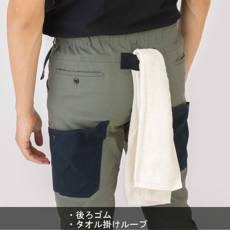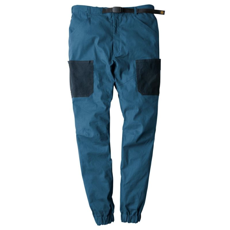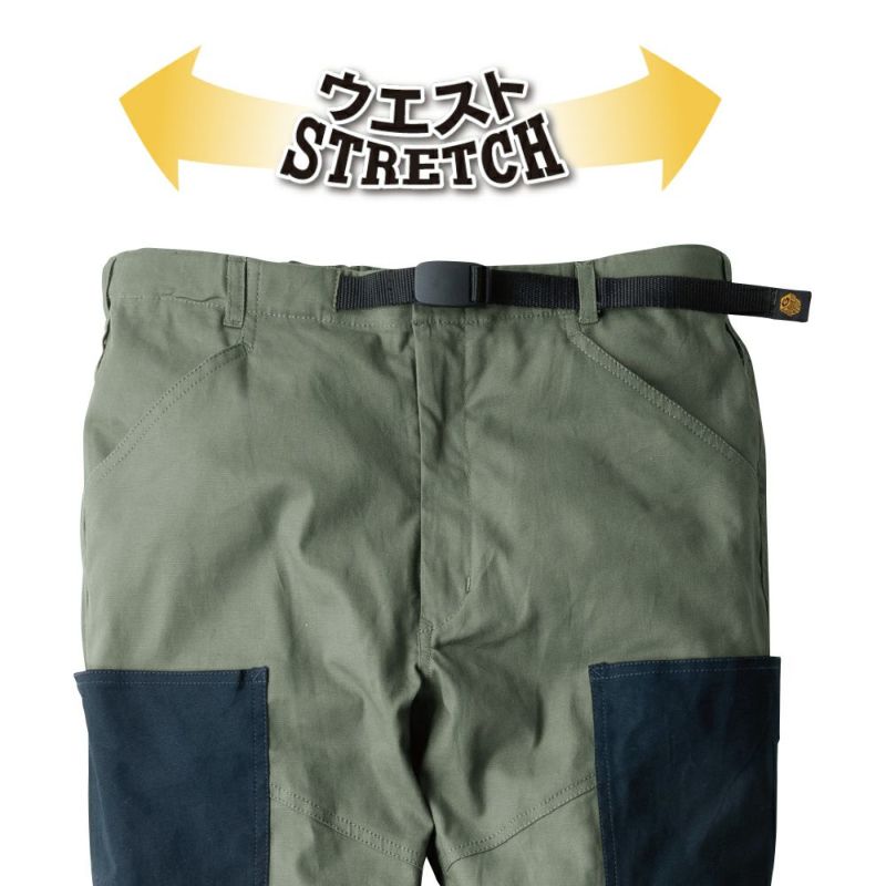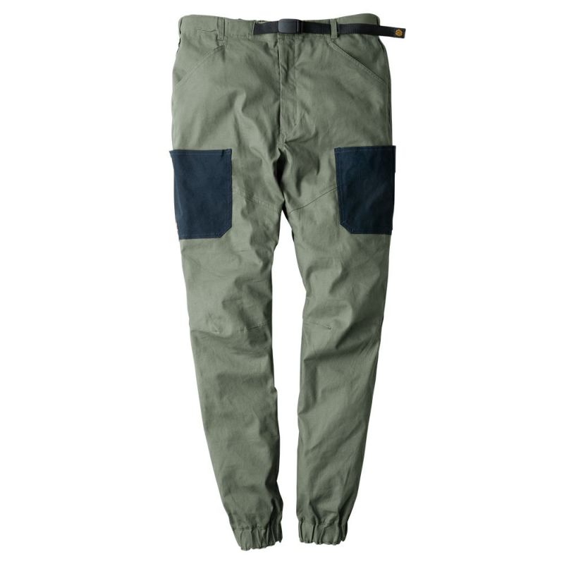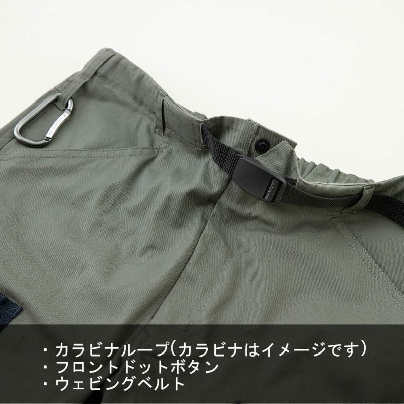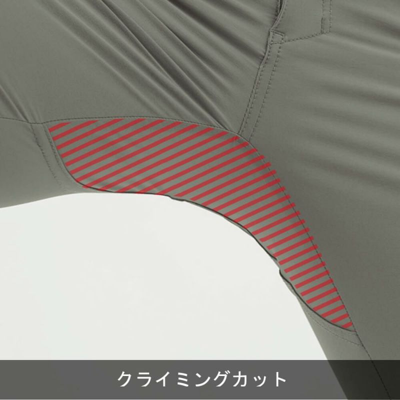 ヨコ25%以上の伸長率がある「アメイジングストレッチ」素材を使用。通常の脇と後ろポケットに加え、前身から後身まで巾がある大容量サイドポケットを装備。後ろにいくほど深さがあり、使い勝手も抜群。ウェストはブランドロゴ入りのウェビングベルト式。両脇のベルトループ下部にカラビナループ付き(カラビナはイメージです)。股部分は突っ張りにくく裂けにくいクライミングカット。後ろ部分にタオル掛けゴムループ付き。裾ゴム仕様