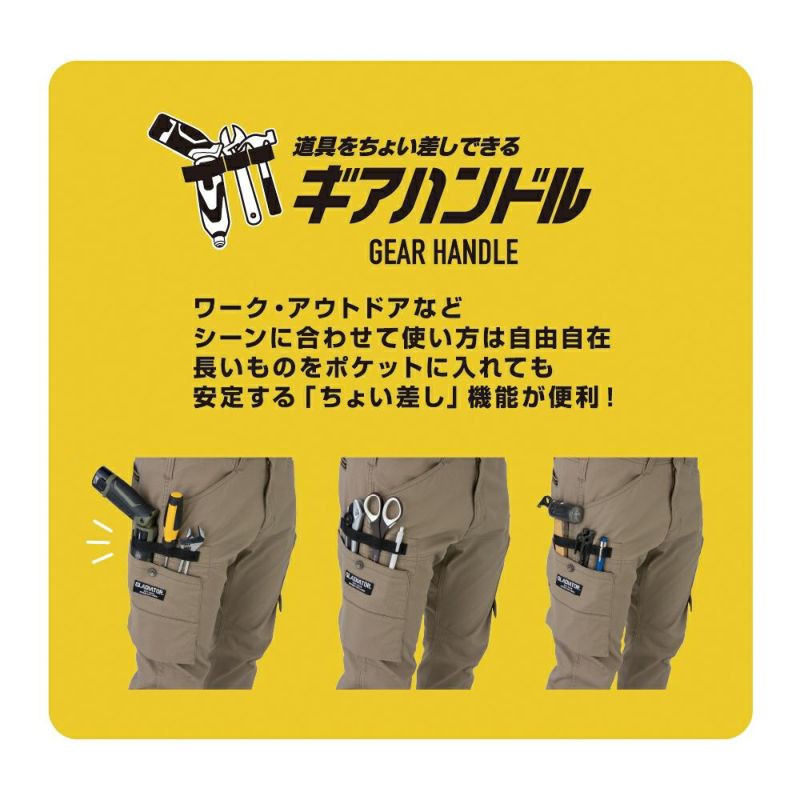 腰袋代わりに道具をちょい差し出来るギアハンドルポケット採用 【GLADIATOR】ストレッチマイクロヘリンボンカーゴパンツ
