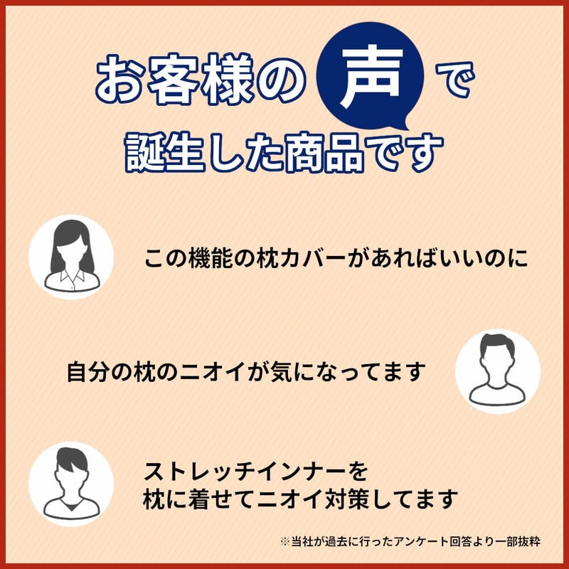 すでにストレッチインナーで汗臭・加齢臭の消臭に実績のある生地を使用。ニオイの原因となる成分を最大99%分解消臭し無臭化する枕カバー。