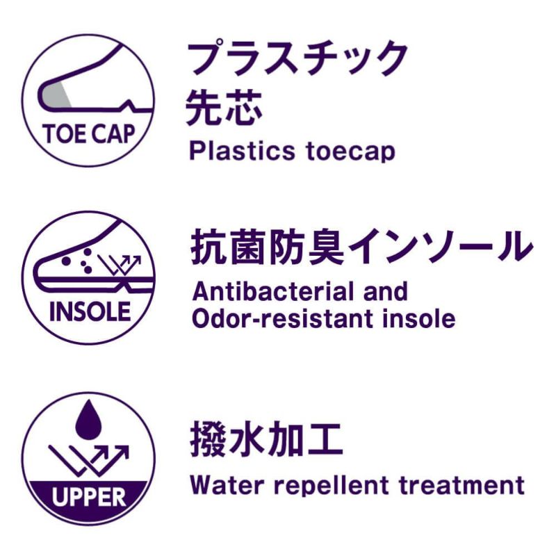 反射素材やアッパーの撥水加工、抗菌防臭インソールなどワーク機能もしっかり完備