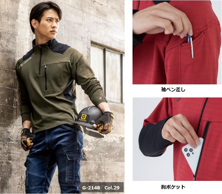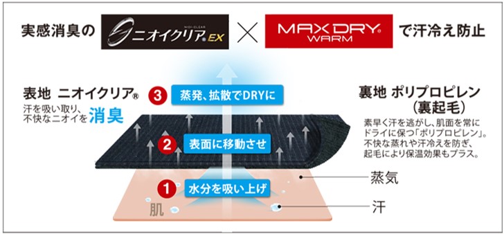 肌面は疎水性の高いポリプロピレン素材で汗を素早く透過させ汗冷えを防ぐ「MAXDRY® WARM」、表面は吸汗性と消臭に優れたニオイクリアを使用することで吸汗速乾性・保温性・実感消臭を実現したDRY構造素材。秋冬のワークシーンに欠かせない保温性とドライ感が続く、快適な着用感です。