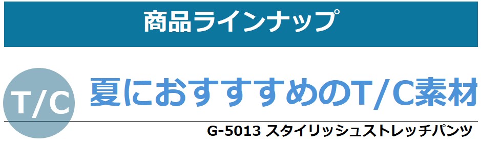 T/C素材とは、T=テトロン(別名:ポリエステル)、C=コットン(綿)の混紡素材です。両方の素材のいいとこ取りをしており、コットンの肌ざわりのよさと優れた吸水・通気性を持ちつつ、ポリエステルが混紡されていることにより、しわになりにくく、速乾性があります。夏蒸し暑い夏にもおススメの素材です。