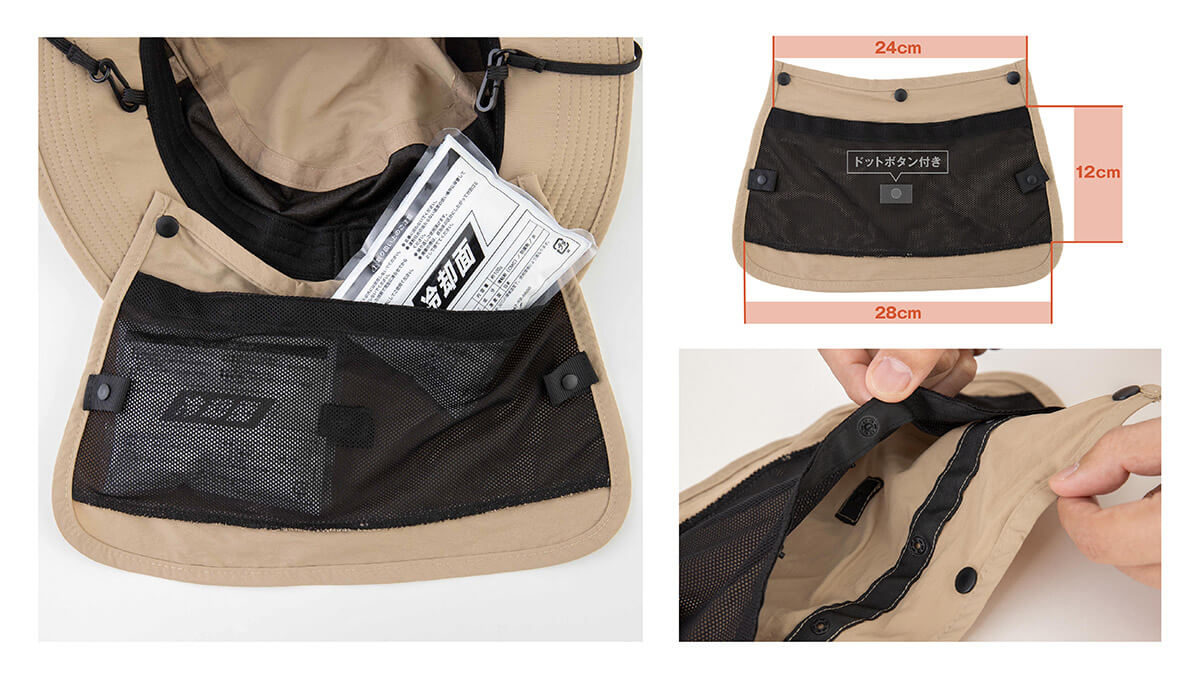 保冷剤が入れられるアイスシェードは帽子とスナップボタンで簡単に脱着可能。