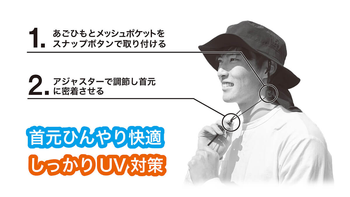 さらにあご紐はアジャスター付きなので首元にしっかりと密着させ、UV対策と暑さ対策が両立できます。