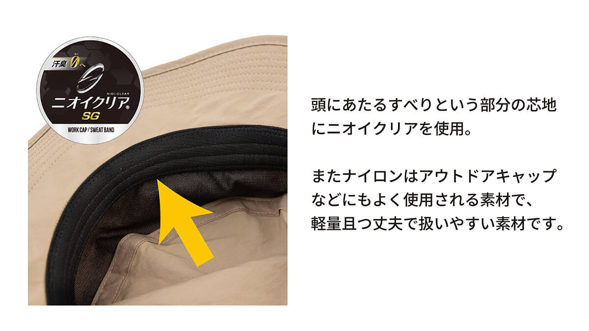 さらに芯地と呼ばれる頭と密着する部分には、コーコス信岡オリジナル消臭ブランド「ニオイクリア」を使用。