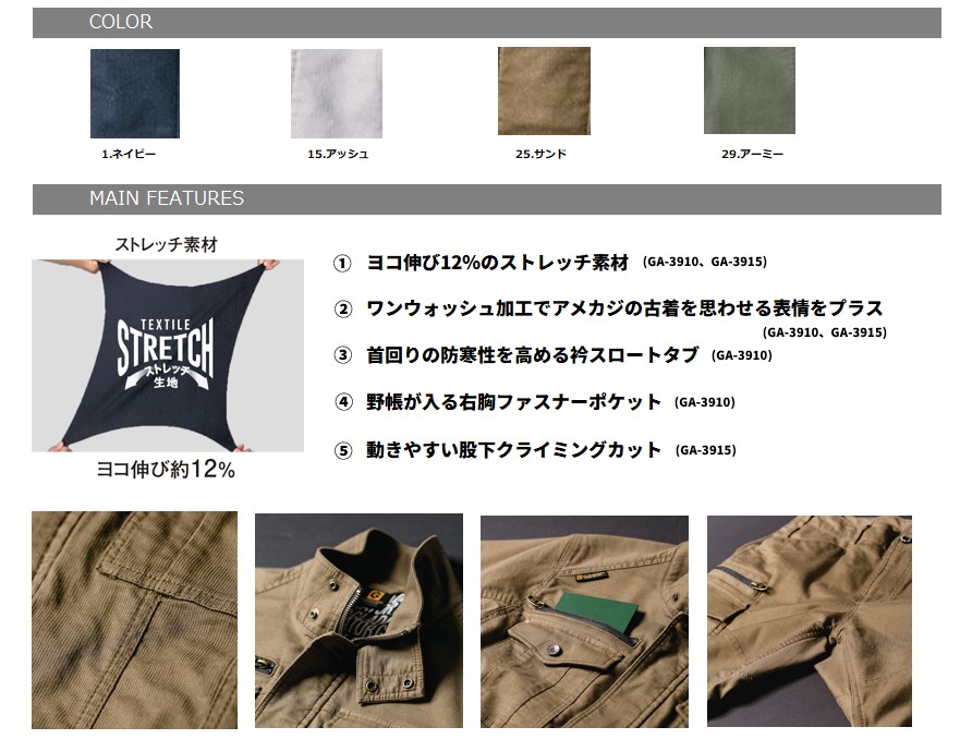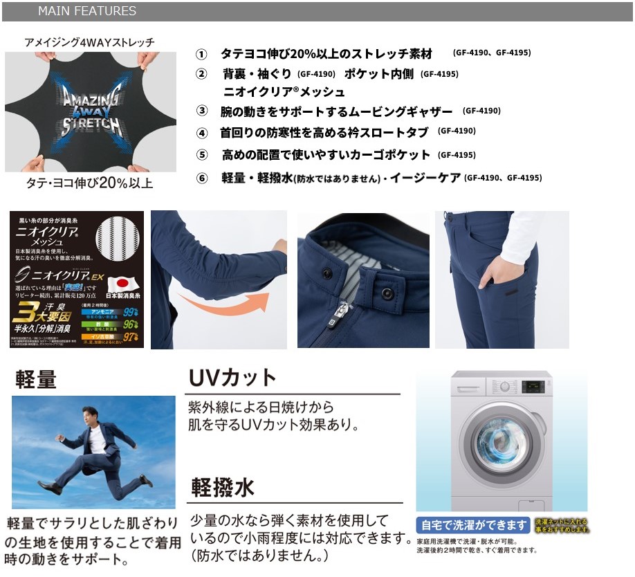 “フォーマル”な美しさと“ワーク”の機能性を掛け合わせたスーツのような作業服。タテヨコに20%以上伸びる驚異のストレッチ素材 かつ軽量でストレスフリー。ワークシーンの激しい動きにも対応。軽撥水素材なので小雨程度であれば対応可能です(※防水ではありません) また洗濯後の速乾性と形状回復性が良く、しわになりにくいイージーケアなのもうれしい。