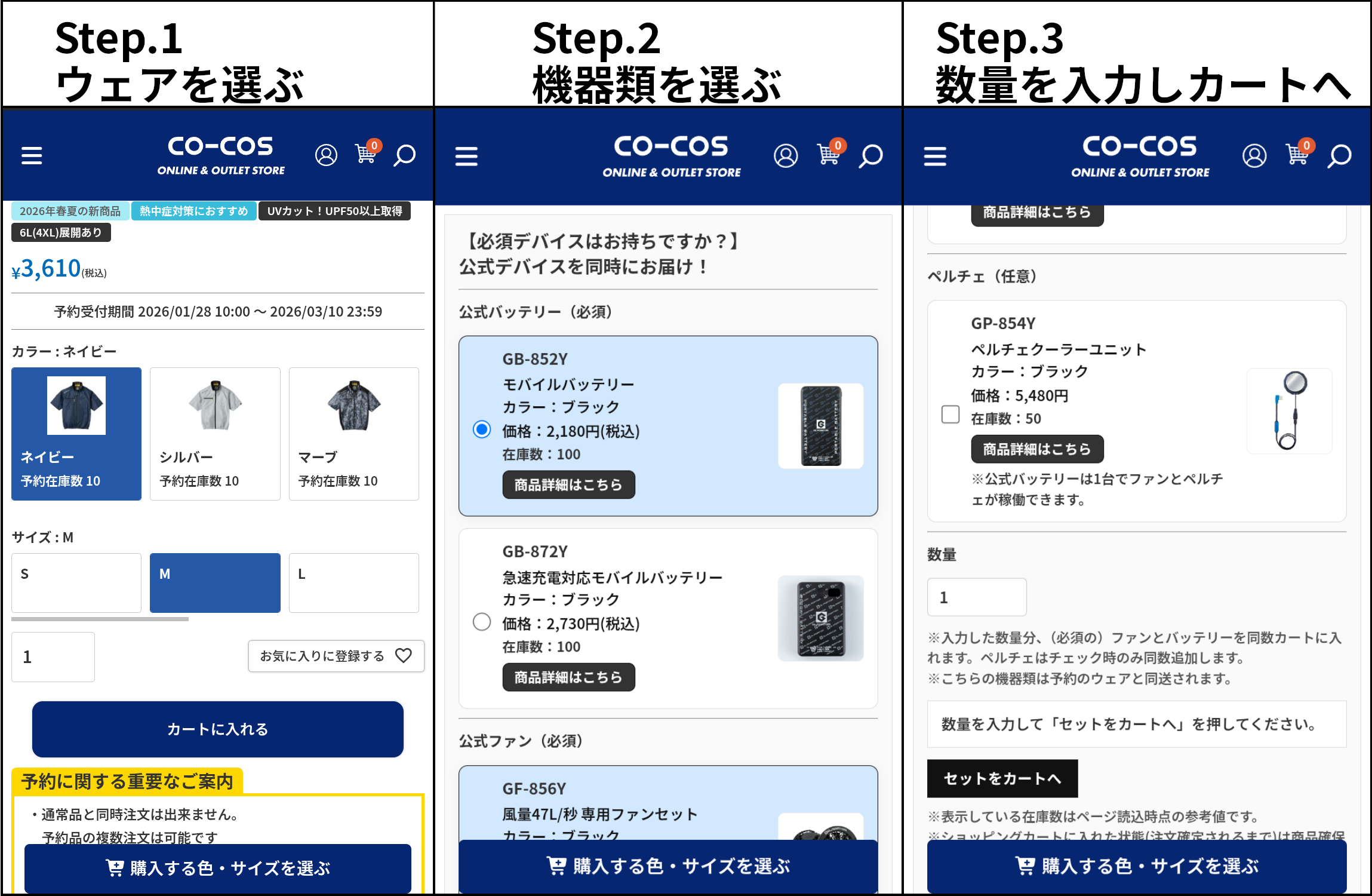 例として数量3を入れると、選択したバッテリー・ファン・ペルチェ(ペルチェは任意)が3点ずつカート投入されます。