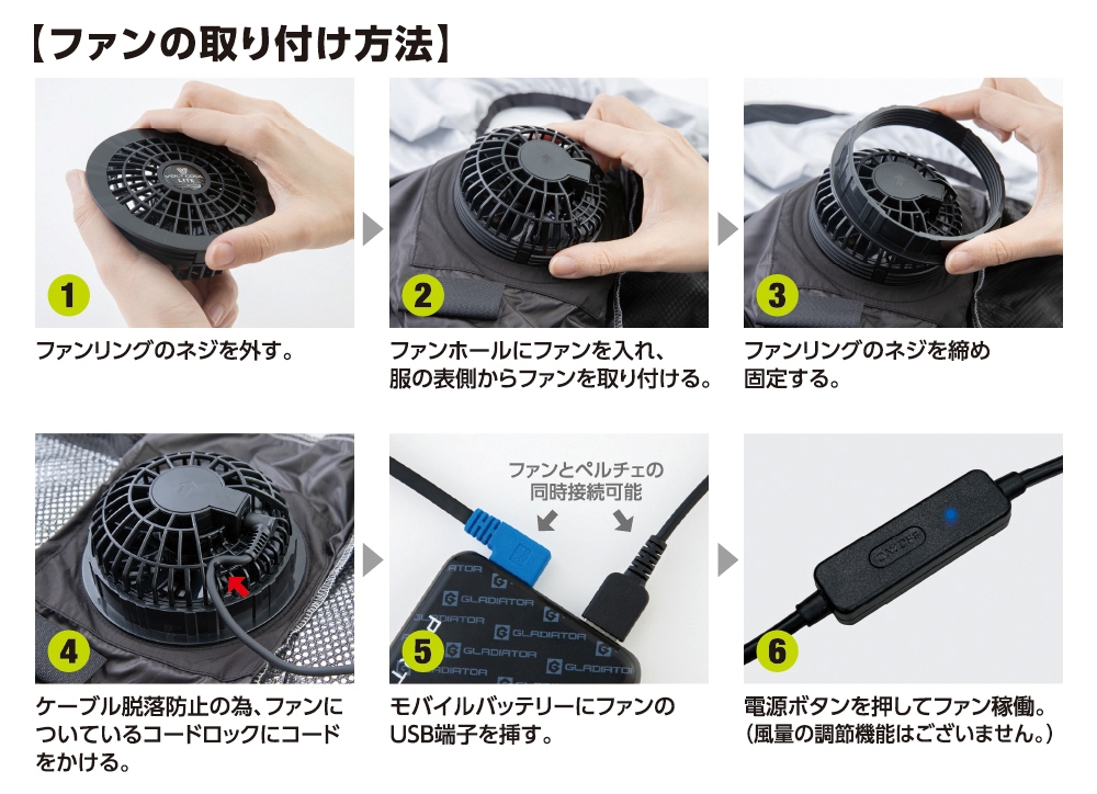 バッテリーを強力な物に変えてもファン自体の風量は変わらず、故障や破損の原因となり危険ですので使用しないでください。